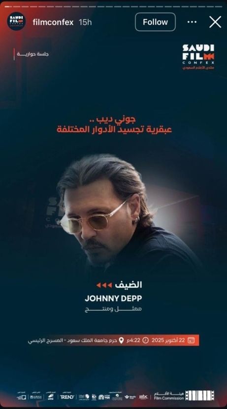 النجم العالمي ذو الصيت الواسع جوني ديب، البالغ من العمر 62 عاماً، يتواجد في الرياض لحضور جلسة حوارية بعنوان "جوني ديب... عبقرية تجسيد الأدوار المختلفة"، وذلك ضمن فعاليات منتدى الأفلام السعودي بنسخته الثالثة، وتحاوره فيها الفنانة فاطمة البنوي.