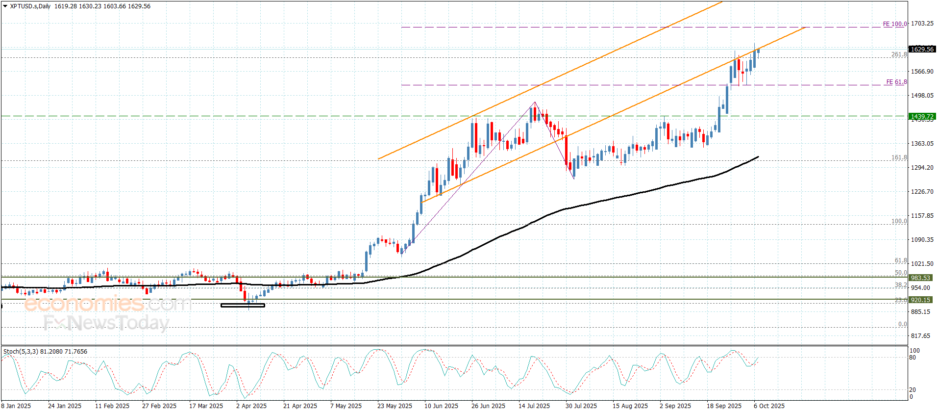 استغل سعر البلاتين توفّر العزم الإيجابي الناتج عن اتحاد المؤشرات الرئيسية ليحافظ على فرص استئناف الهجوم الصاعد بمهاجمته حاليا للمقاومة الممتدة نحو 1630.00$ بهدف إيجاد منفذ لتحقيق مكاسب جديدة قد تمتد قريبا نحو 1660.00$ و1690.00 على التوالي.