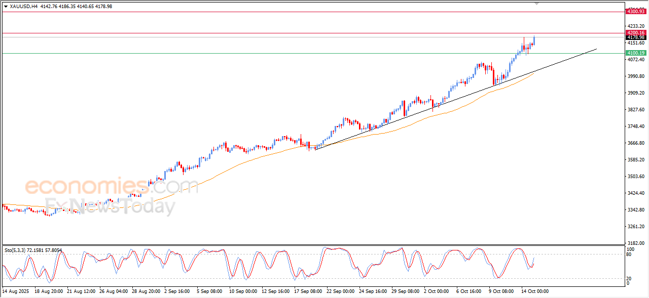 صعد سعر الذهب (GOLD) خلال تداولاته الأخيرة على المستويات اللحظية، مسجلاً مستوى قياسيًا جديدًا، مقتربًا من مستهدفنا السعري عند المقاومة 4,200$، مدفوعًا بتوارد الإشارات الإيجابية من مؤشرات القوة النسبية، بعد أن نجح السعر سابقًا في تصريف تشبعه الشرائي بها، مما يمنحه مساحة أوسع لمواصلة المكاسب واستهداف قمم جديدة على المدى القريب.