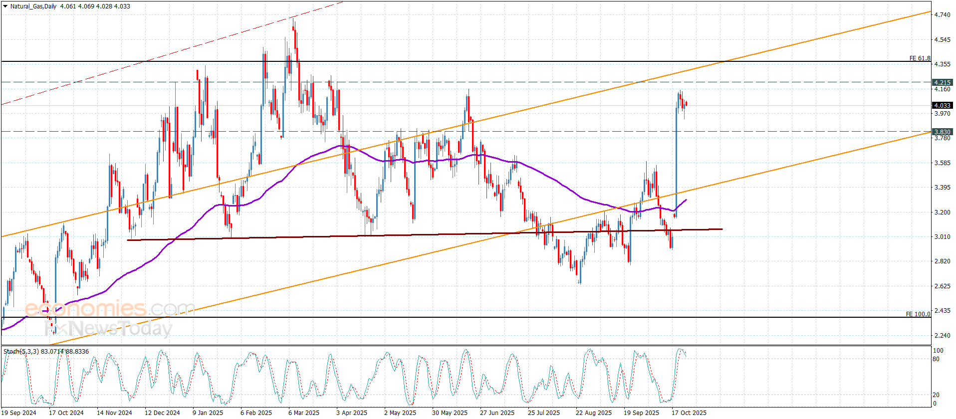 بالرغم من افتقار سعر الغاز مؤخرا للعزم الإيجابي بمحاولة خروج مؤشر ستوكاستيك من مستوى تشبع الشراء إلا أن صموده الإيجابي فوق مستوى الدعم الأولي والمتمركز عند 3.830$ يؤكد تمسكه بالسيناريو الصاعد لنلاحظ تذبذبه حاليا قرب 4.050$ بهدف إيجاد فرصة لاكتساب العزم الإيجابي من جديد.