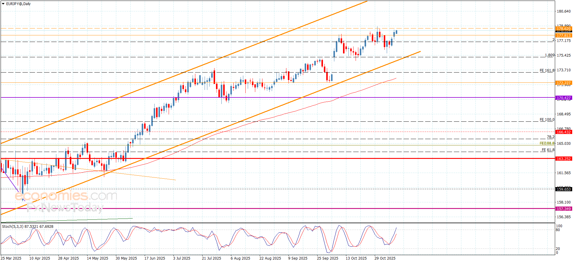 تعرض سعر الزوج لضغوط إيجابية جديدة نتيجة لاقتراب مؤشر ستوكاستيك من مستوى تشبع الشراء لنلاحظ تحقيقه حاليا لبعض المكاسب باستقراره قرب 178.45.