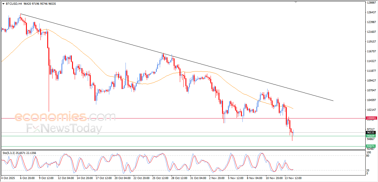 استقر سعر البتكوين (BTCUSD) على انخفاض خلال تداولاته اللحظية الأخيرة، ليظل مستنداً لمستوى الدعم الحالي 95,500$، هذا الدعم الذي كان هدفاً محتملاً لنا بتقاريرنا السابقة، في ظل استمرار الضغط السلبي الناتج من تداولاته دون متوسطه المتحرك البسيط لفترة 50، وتحت هيمنة الاتجاه الرئيسي الهابط على المدى القصير وتداولاته بمحاذاة خط ميل، ولكن في المقابل من ذلك نلاحظ بدء ظهور تقاطع إيجابي بمؤشرات القوة النسبية، بعد وصولها لمناطق شديدة التشبع بعمليات البيع، وهو ما ساعد على تماسك لحظي للسعر.