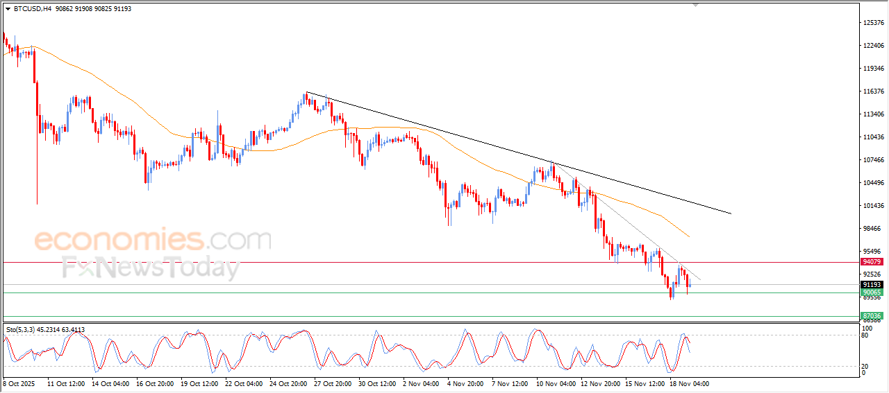 يستقر سعر البتكوين (BTCUSD) على انخفاض خلال تداولاته اللحظية الأخيرة، ليصل إلى مستوى الدعم الرئيسي 90,000$، هذا الدعم الذي كان مستهدفاً سعرياً لنا بتقاريرنا السابقة، ويأتي هذا مع تشكل دايفرجنس سلبي بمؤشرات القوة النسبية، بعد وصولها لمناطق شديدة التشبع بعمليات الشراء، بصورة مبالغ فيها مقارنة بحركة السعر، وفي ظل سيطرة الاتجاه الرئيسي الهابط على المدى القصير مع تحركاته بمحاذاة خطوط ميل رئيسية وفرعية تعزز من هيمنة هذا المسار.