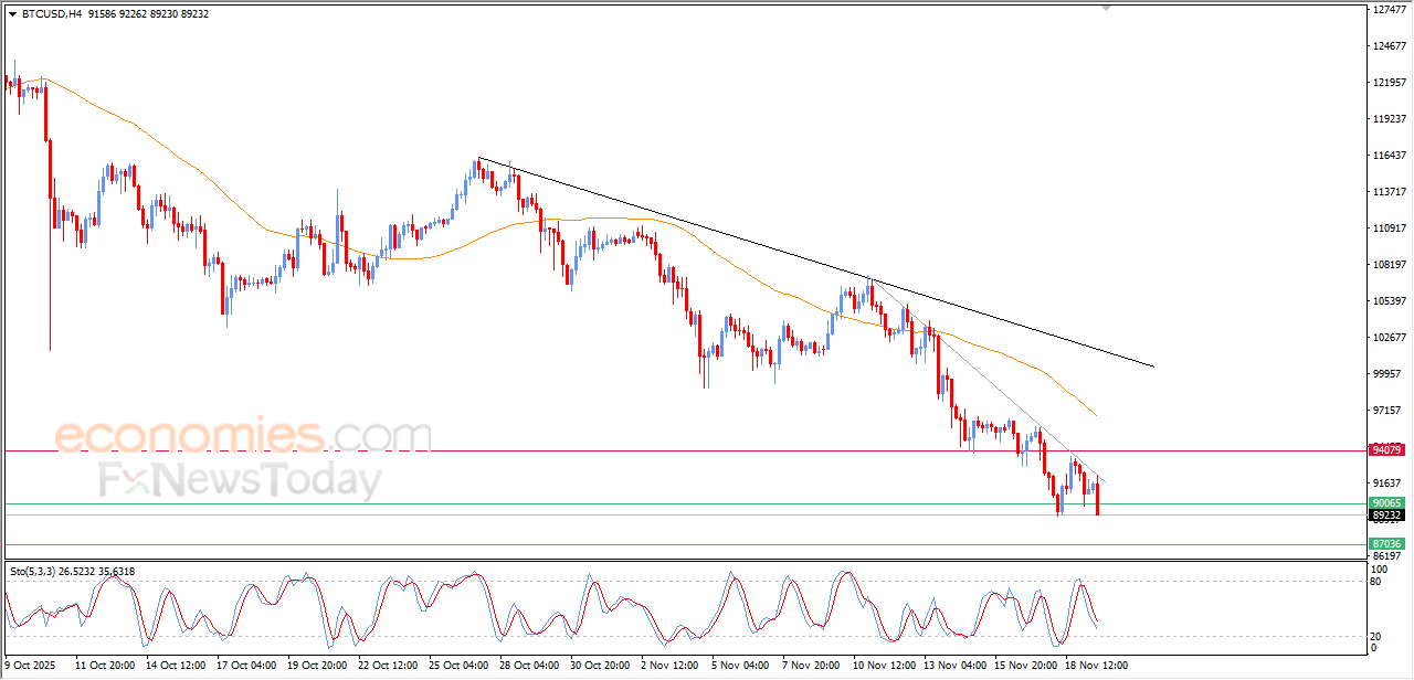 انخفض سعر البتكوين (BTCUSD) خلال تداولاته اللحظية الأخيرة، ليكسر مستوى الدعم 90,000$، وسط توارد الإشارات السلبية بمؤشرات القوة النسبية، بعد وصولها لمناطق شديدة التشبع بعمليات الشراء، وتحت سيطرة الاتجاه الرئيسي الهابط على المدى القصير وتداولاته بمحاذاة خطوط ميل رئيسية وفرعية داعمة لهذا المسار.