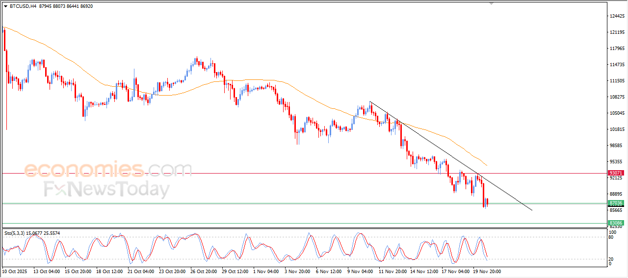 انخفض سعر البتكوين (BTCUSD) خلال تداولاته اللحظية الأخيرة، ليقترب من كسر مستوى الدعم الحالي 87,000$، وهو المستوى الذي حددناه سابقاً كهدف محتمل للحركة الهابطة، ويأتي هذا التراجع وسط استمرار الضغط السلبي الناتج من بقاء السعر دون متوسطه المتحرك البسيط لفترة 50، ما يعزز من هيمنة البائعين على المشهد العام، خاصة مع تحركات السعر بمحاذاة خط ميل فرعي يدعم الاتجاه الهابط على المدى القصير.