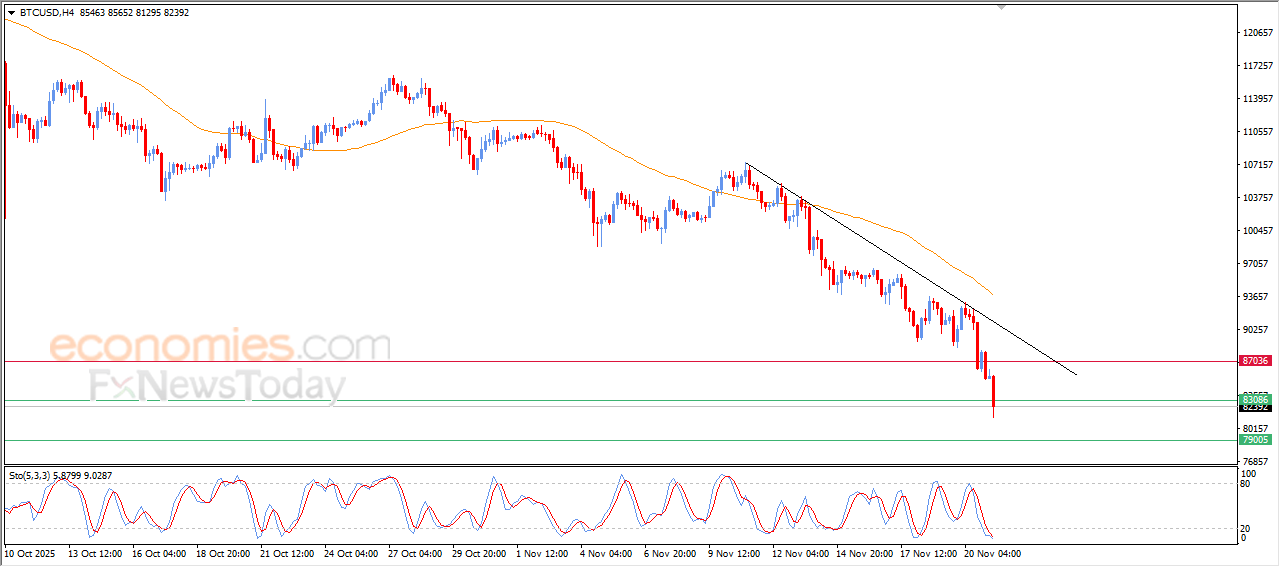واصل سعر البتكوين (BTCUSD) الهبوط خلال تداولاته اللحظية الأخيرة، ليصل السعر إلى مستوى الدعم 83,000$، هذا الدعم الذي كان مستهدفاً سعرياً لنا بتحليلاتنا السابقة، في ظل سيطرة الاتجاه الرئيسي الهابط على المدى القصير وتداولاته بمحاذاة خط ميل فرعي داعم لهذا المسار، بالإضافة لاستمرار توارد الإشارات السلبية بمؤشرات القوة النسبية، بالرغم من وصولها لمناطق شديدة التشبع بعمليات البيع، ما يشير إلى قوة الزخم السلبي المحيط بالسعر.