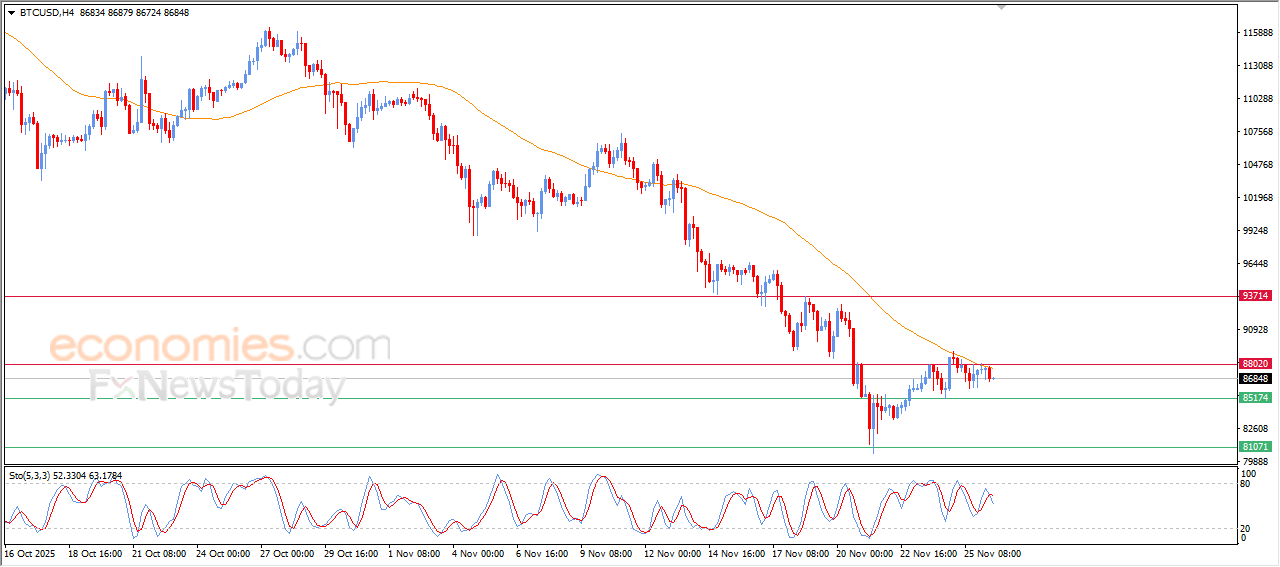 استسلم سعر البتكوين (BTCUSD) للضغط السلبي على المدى اللحظي الأخير، حيث تراجع على اثر ثبات مستوى المقاومة 88,000$، مع ملامسته لمقاومة متوسطه المتحرك البسيط لفترة 50، ما ضاعف من الضغط السلبي عليه خاصة ويأتي هذا مع بدء توارد الإشارات السلبية من مؤشرات القوة النسبية، وتحت سيطرة الاتجاه الرئيسي الهابط على المدى القصير.