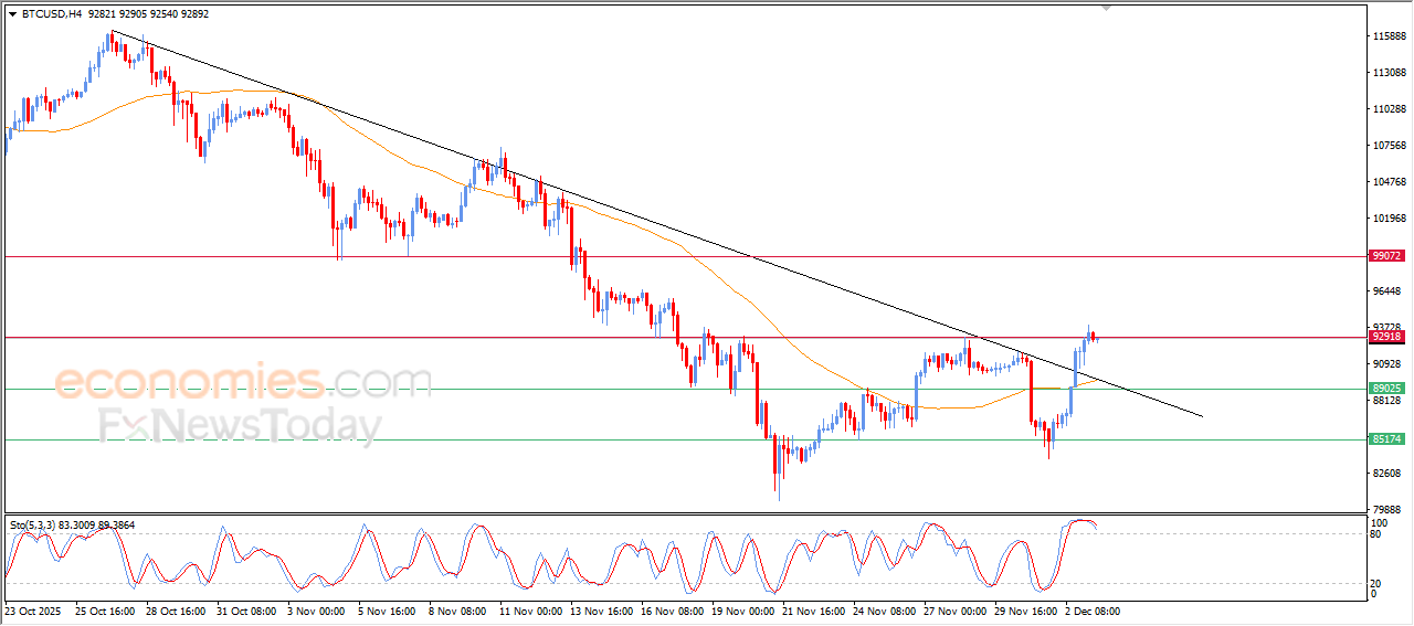 يحافظ سعر البتكوين (BTCUSD) على مكاسبه الأخيرة بمستوياته اللحظية الأخيرة، ليحاول تصريف البعض من تشبعه الشرائي بمؤشرات القوة النسبية، خاصة مع بدء توارد الإشارات السلبية منها، ليتخلص بذلك من أي ضغوط سلبية محيطة به ليساعده ذلك في اختراق مستوى المقاومة المهم 93,000$، مستفيداً من اختراقه في وقت سابق لخط اتجاه رئيسي هابط على المدى القصير، ومدعوماً بتداولاته المستمرة أعلى متوسطه المتحرك البسيط لفترة 50، ما يجدد الزخم الإيجابي المحيط به.
