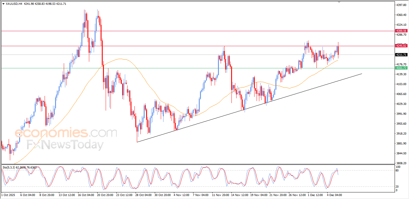 انزلق بثبات سعر الذهب (GOLD) انخفاضاً خلال تداولاته اللحظية الأخيرة، وذلك على اثر ثبات مستوى المقاومة المحوري 4,245$، ليحاول من جديد اكتساب زخماً إيجابياً قد يساعده على اختراق تلك المقاومة العنيدة، في الوقت نفسه يحاول تصريف البعض من تشبعه الشرائي الواضح بمؤشرات القوة النسبية، خاصة مع بدء ظهور تقاطع سلبي بها، في ظل سيطرة الاتجاه الرئيسي الصاعد على المدى القصير.
