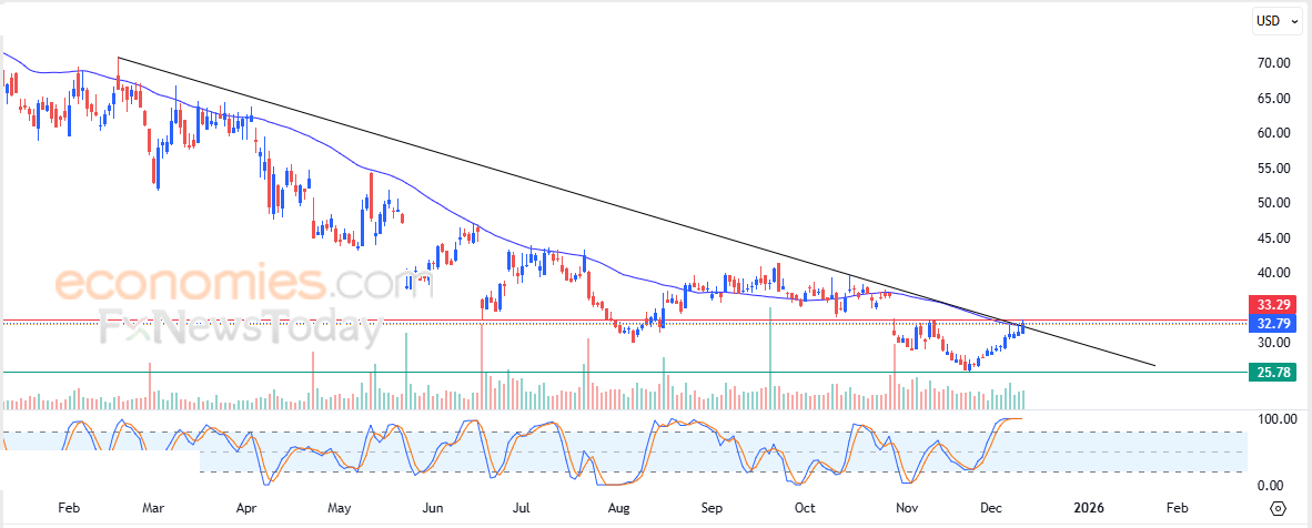 لذلك فتوقعاتنا تميل نحو هبوط سعر السهم خلال تداولاته القادمة، طيلة ثبات مستوى المقاومة 33.30$، ليستهدف مستوى الدعم 25.80$.