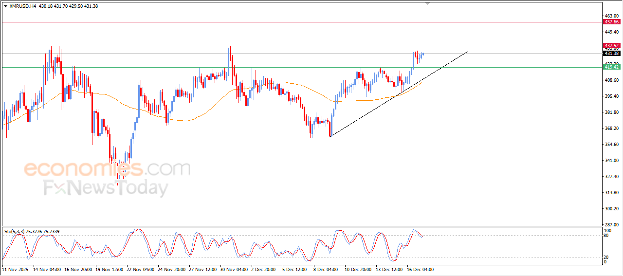 تقدم سعر عملة مونيرو كوين (XMRUSD) بتداولاته الأخيرة على المستويات اللحظية، ليستعد السعر بمهاجمة مستوى المقاومة المحوري 437.50، مدعوماً بتداولاته المستمرة أعلى متوسطه المتحرك البسيط لفترة 50، وتحت سيطرة الاتجاه الرئيسي الصاعد وتداولاته بمحاذاة خ طميل فرعي على المدى القصير داعم لهذا المسار، ولكن في المقابل من ذلك نلاحظ توارد الإشارات السلبية من مؤشرات القوة النسبية، بعد وصولها لمناطق شديدة التشبع بعمليات الشراء، ما قد يكبح من مكاسب السعر القادمة.