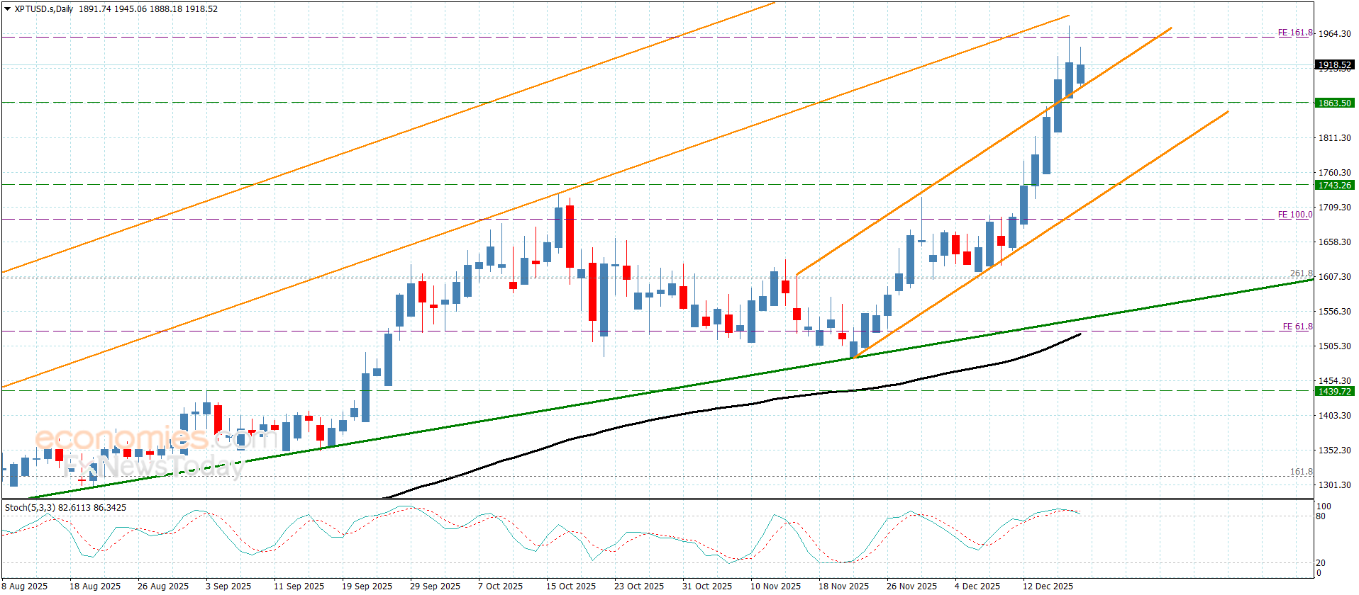 قدّم سعر البلاتين بعض التداولات الجانبية نتيجة لثباته المتكرر دون الحاجز المستقر عند 1960.00$ والذي يشكل بدوره مستوى 161.8% فيبوناتشي الامتدادي ليضطر للهبوط بشكل مؤقت نحو 1890.00$.