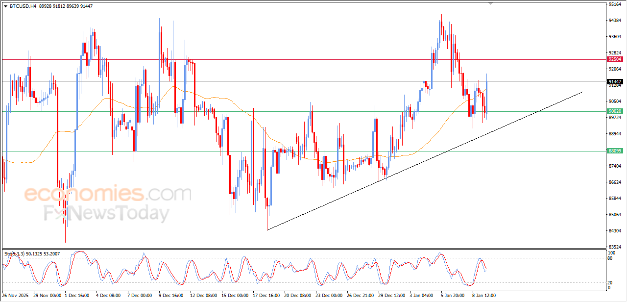 قفز سعر البتكوين (BTCUSD) ارتفاعا خلال تداولاته اللحظية الأخيرة، متأثراً بثبات مستوى الدعم المهم 90,000$، ووسط سيطرة الاتجاه الصاعد على المندى القصير وتداولاته بمحاذاة خط ميل، لينجح السعر بهذا الارتفاع في تخطي مقاومة متوسطه المتحرك البسيط لفترة 50، مع ظهور تقاطع إيجابي من مؤشرات القوة النسبية، بعدما تمكن السعر من تصريف تشبعه الشرائي بها.