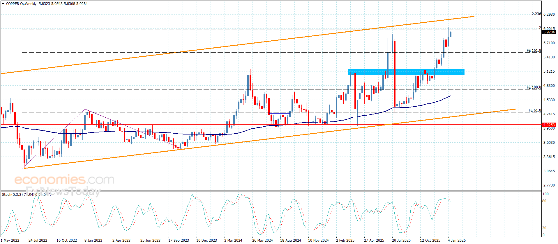 قدّم سعر النحاس منذ تداولات هذا الصباح المزيد من المحاولات الإيجابية ليقترب بذلك من الحاجز المتمركز عند 5.9700$ والذي يشكل بدوره مستوى 2.00% فيبوناتشي الامتدادي ليعوق بثباته فرص تسجيل السعر لأي مكاسب تاريخية جديدة مع توفير فرصة لتقديم تداولات تصحيحية جديدة ليستهدف قريبا لمستوى 5.7500$ و5.5800$ على التوالي
