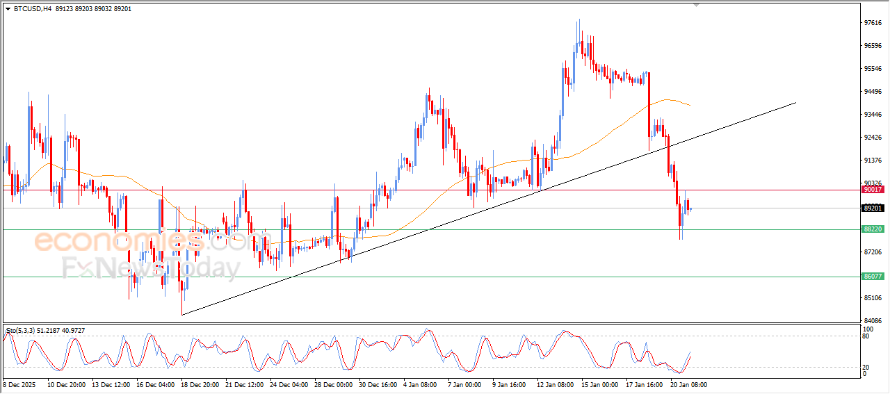 عاود سعر البتكوين (BTCUSD) الانخفاض خلال تداولاته اللحظية الأخيرة، بعدما أعاد السعر اختبار مستوى المقاومة المحوري 90,000$، وتمكن بذلك تصريف تشبعه البيعي بمؤشرات القوة النسبية، وهو ما أجبر السعر على الارتداد انخفاضاً ليمحو البعض من مكاسبه المبكرة، في ظل سيطرة موجة تصحيحية هابطة شديدة الانحدار على المدى القصير، مع استمرار الضغط السلبي نتيجة تداولاته دون متوسطه المتحرك البسيط لفترة 50، ما يضاعف من الضغوط السلبية المحيطة به.