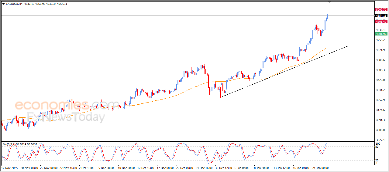 على هذا الأساس تشير توقعاتنا إلى صعود سعر الذهب بتداولاته اللحظية القادمة، خاصة طيلة استقراره أعلى سعر 4,900$، ليسير صوب مستوى المقاومة الرئيسي 5,000$.