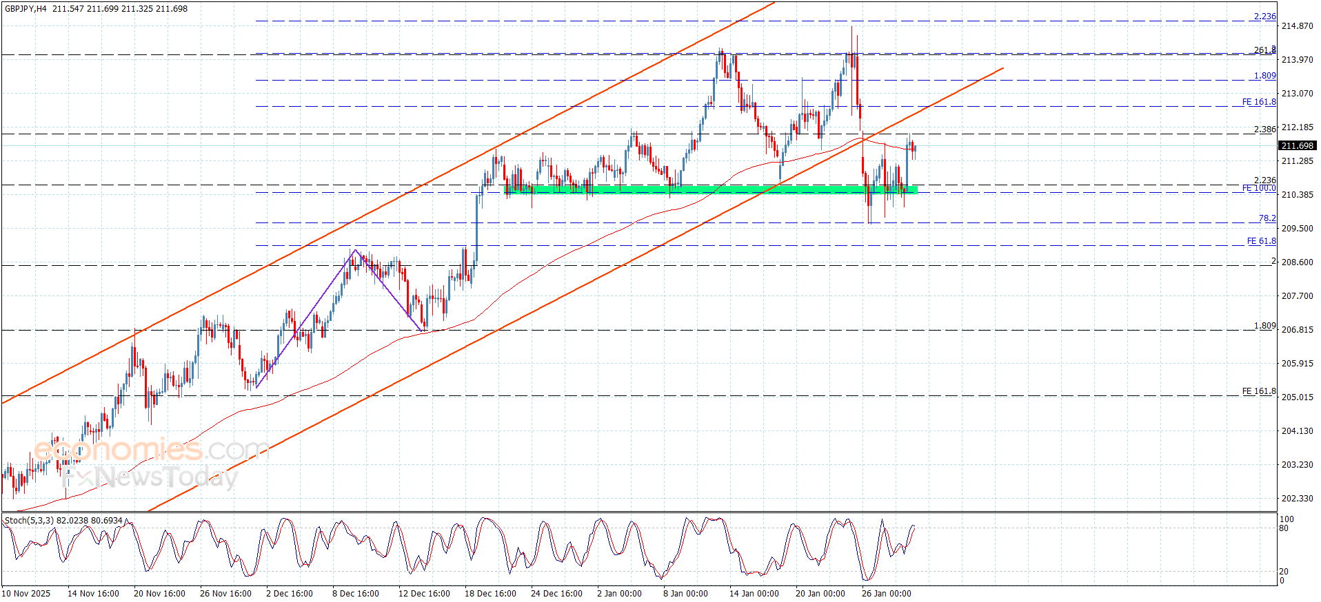 استمرار تقديم المؤشرات الرئيسية للعزم الإيجابي سيدعم فرص اختراق السعر لمستوى 212.15 سيعزز فرص مهاجمته لدعم القناة الصاعدة المكسور والممتد حاليا نحو 212.55 والذي يشكل بدوره مفتاح تأكيد الاتجاه العام للتداولات القادمة, فاختراق هذا المستوى سيؤكد استعداد السعر لتسجيل مكاسب جديدة قد تبدأ من 213.00 و213.45, أما مخاطرة تغيير الاتجاه الصاعد تكمن بمحاولة كسر السعر للدعم المستقر عند 210.40.