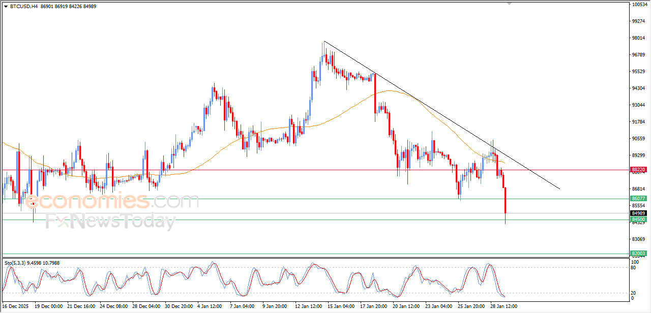 انزلق سعر البتكوين (BTCUSD) انخفاضاً خلال تداولاته اللحظية الأخيرة، ليكسر مستوى الدعم 86,000$ هذا الدعم الذي كان هدفاً سعرياً لنا بتحليلاتنا السابقة، وليصل بدوره إلى الدعم المحوري 84,500$ استعداداً لكسره، وسط استمرار الضغط السلبي نتيجة تداولاته دون متوسطه المتحرك البسيط لفترة 50، مع سيطرة الاتجاه الهابط وتداولاته بمحاذاة خط ميل داعم لهذا المسار، بالإضافة لتوارد الإشارات السلبية من مؤشرات القوة النسبية، بالرغم من وصولها لمناطق شديدة التشبع بعمليات البيع.