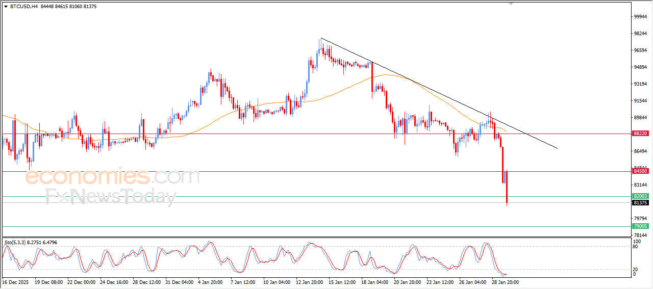 واصل سعر البتكوين (BTCUSD) هبوطه خلال تداولاته اللحظية الأخيرة، ليكسر مستوى الدعم 82,000$، وهو المستوى الذي كان هدفاً سعرياً لنا في تحليلاتنا السابقة، ويأتي هذا التراجع في ظل سيطرة الاتجاه الرئيسي الهابط على المدى القصير، مع تحركات السعر بمحاذاة خط ميل داعم لهذا المسار السلبي.