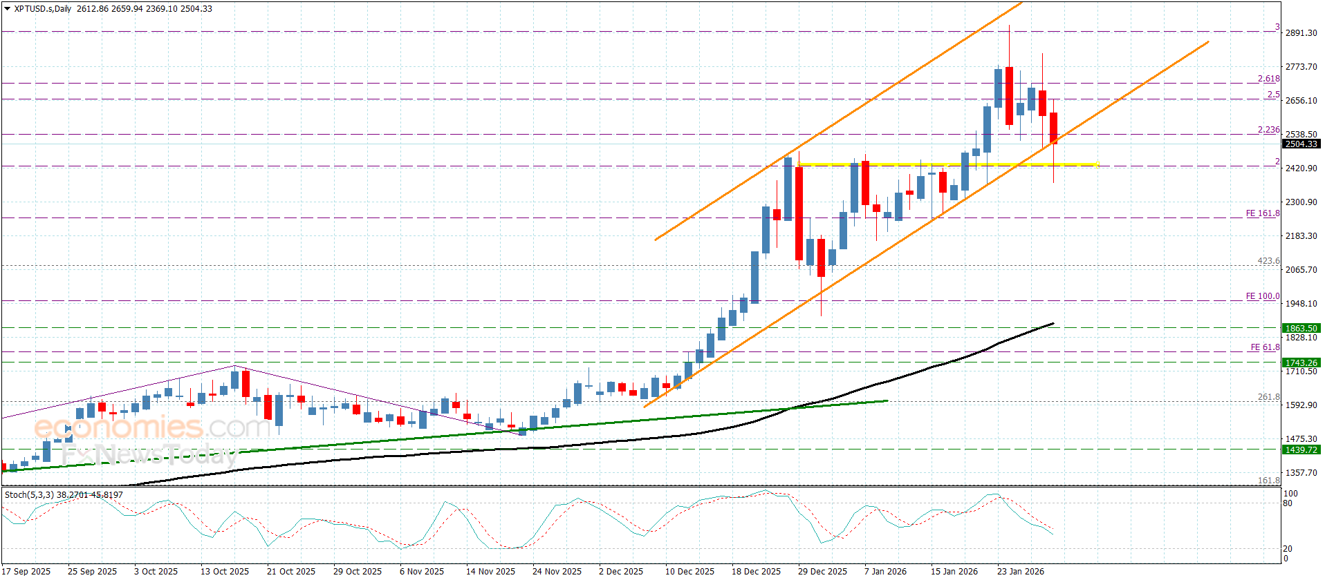 تعرض سعر البلاتين يوم أمس لضغوط سلبية قوية ليجبره ذلك على تقديم تداولات تصحيحية سلبية بتسلله نحو 2370.00$ ومن ثم ليرتد ليستقر فوق دعم القناة الفرعية الصاعدة والمتمثل بمستوى 2520.00$.