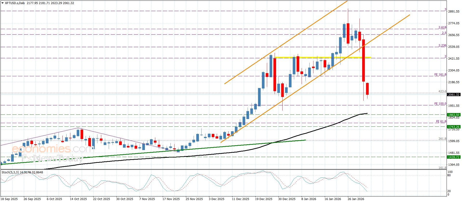 استسلم سعر البلاتين مؤخرا للضغوط السلبية مستأنفا بذلك الهجوم التصحيحي الهابط ليجبره ذلك على كسر الدعم الإضافي المستقر عند 2250.00$ لنلاحظ تكبده لخسائر كبيرة بوصوله نحو 2003.00$.