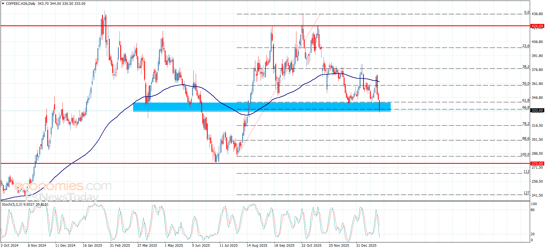 تعرض سعر القهوة بتداولاته الأخيرة لضغوط سلبية قوية ليجبره ذلك على الثبات مجددا دون مستوى تصحيح 50% فيبوناتشي المتمركز عند 360.00 لنلاحظ تكبده لخسائر كبيرة بهبوطه حاليا نحو الدعم المستقر عند 330.00.