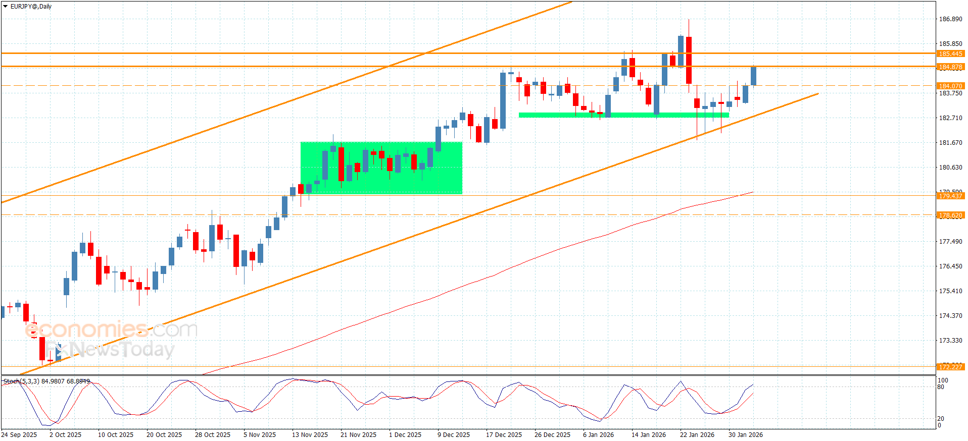 توفر العوامل الإيجابية بالثبات العام ضمن محاور القناة الصاعدة إضافة لاستمرار تقديم المؤشرات الرئيسية للعزم الإيجابي سيزيد من فرص تسجيل السعر لمكاسب إضافية لننتظر انجذابه قريبا نحو 185.45 وبتجاوزه قد ينجح بالضغط على الحاجز المستقر عند 186.20 ليشكل بدوره الهدف الرئيسي التالي للتداولات الحالية.