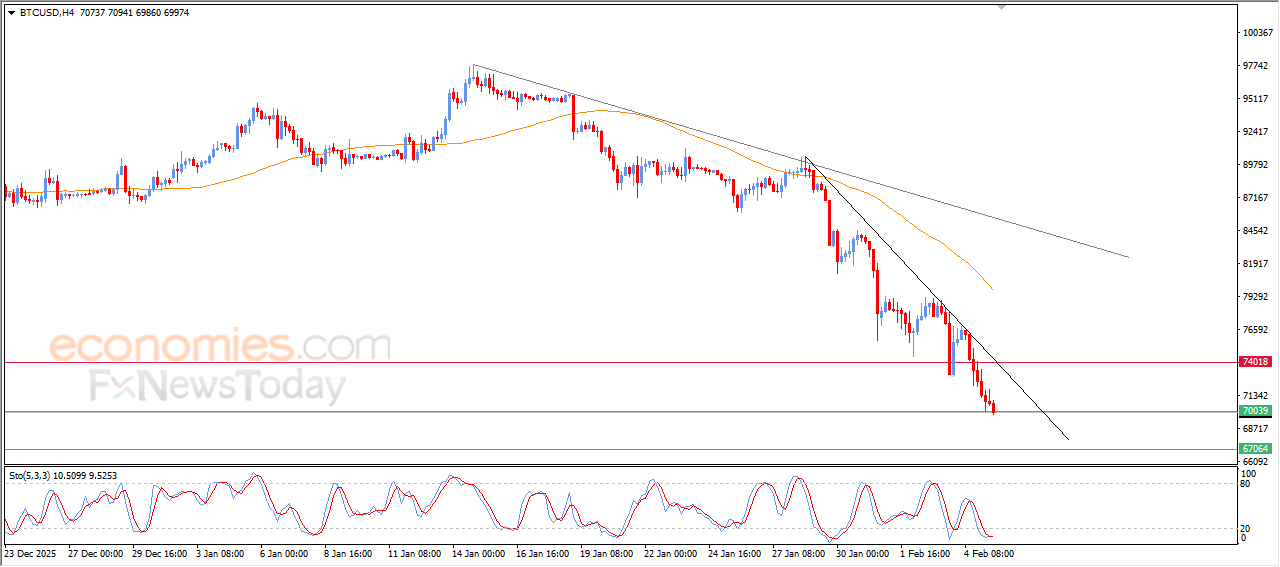 واصل سعر البتكوين (BTCUSD) الهبوط خلال تداولاته اللحظية الأخيرة، ليصل بتراجعه الأخير إلى مستوى الدعم الرئيسي 70,000$، هذا الدعم الذي كان هدفاً سعرياً لنا بتحليلاتنا السابقة، في ظل سيطرة تامة للاتجاه الرئيسي الهابط على المدى القصير، مع تحركاته بمحاذاة خطوط ميل رئيسية وفرعية داعمة لهذا المسار، بالإضافة لاستمرار الضغط السلبي نتيجة تداولاته دون متوسطه المتحرك البسيط لفترة 50، ولكن في المقابل من ذلك نلاحظ بدء ظهور تقاطع إيجابي من مؤشرات القوة النسبية، بعد وصولها لمناطق شديدة التشبع بعمليات البيع، ما قد يجعلنا نشهد بعض التذبذبات الحذرة في الفترة المقبلة.