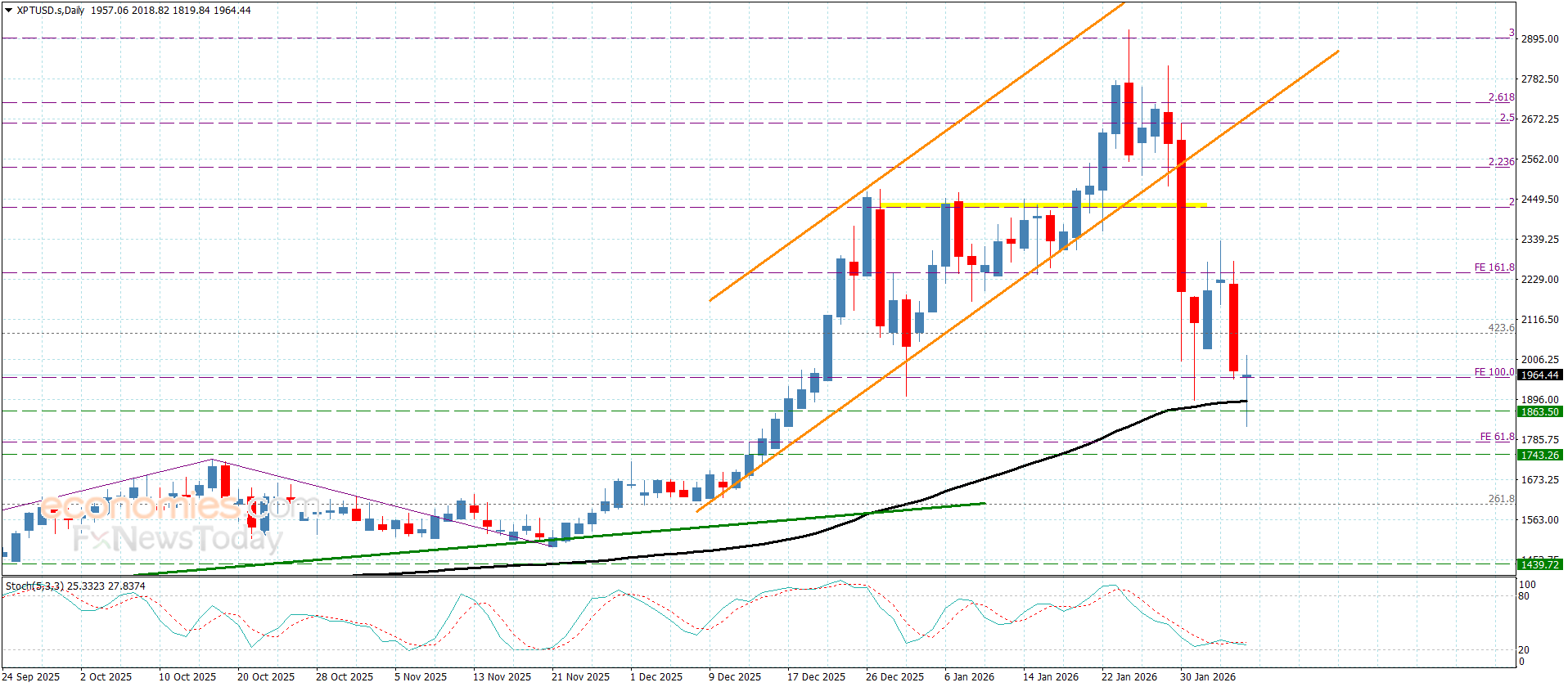 واصل سعر البلاتين تشكيله لموجات تصحيحية هابطة منذ تداولات يوم أمس نتيجة للثبات السلبي المتكرر دون الحاجز الإضافي المستقر عند 2245.00$ لنلاحظ تسلله دون الدعم الأولي المستقر عند 1950.00$ وملامسته خلال تداولات هذا الصباح لمستوى 1820.00$.