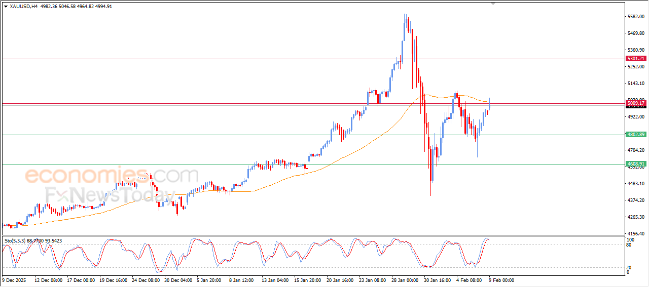 على هذا الأساس تميل توقعاتنا إلى انخفاض سعر الذهب خلال تداولاته اللحظية القادمة، طيلة ثبات مستوى المقاومة 5,000$، ليستهدف مستوى الدعم 4,800$.