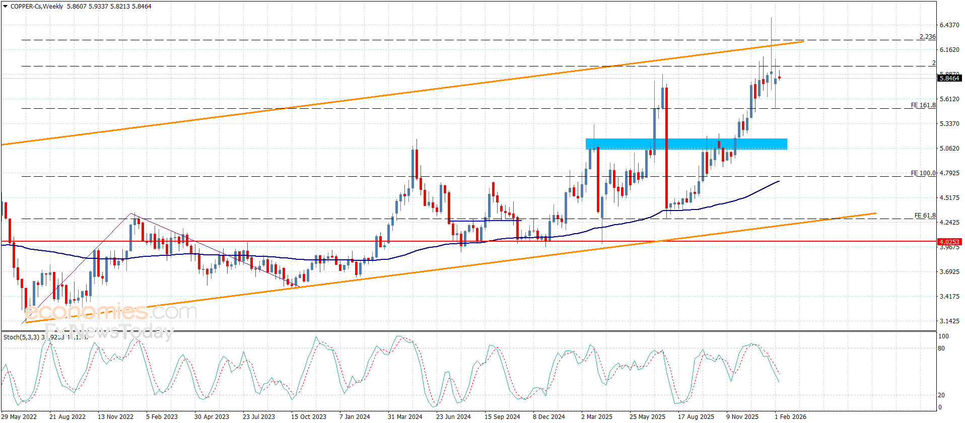 لامس سعر النحاس بتداولات يوم الجمعة الهدف التصحيحي بوصوله نحو الدعم الإضافي المستقر عند 5.5100$ ومن ثم ليشكل ارتداد سريع إلا أن تمركزه المتكرر دون الحاجز المستقر عند 5.9700$ وبتقديم مؤشر ستوكاستيك للعزم السلبي، فإن ذلك يدعونا للتمسك بالترجيح التصحيحي لتداولات الفترة القريبة.