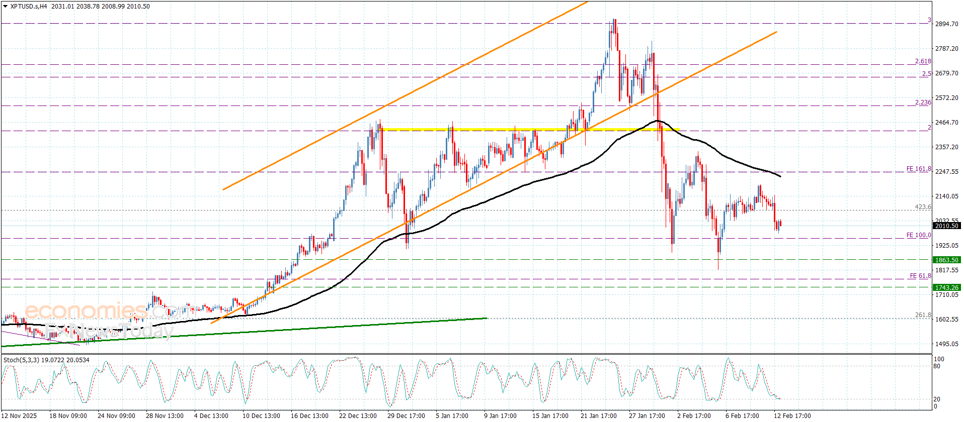 جدد سعر البلاتين منذ تداولات يوم أمس المحاولات التصحيحية السلبية متأثرا بالعوامل السلبية المتمثلة باستمرار تشكيل مستوى 2245.00$ لحاجز قوي إضافة لاتحاد تقديم المؤشرات الرئيسية للعزم السلبي لنلاحظ اقترابه حاليا من الهدف الأول المستقر عند 1950.00$.