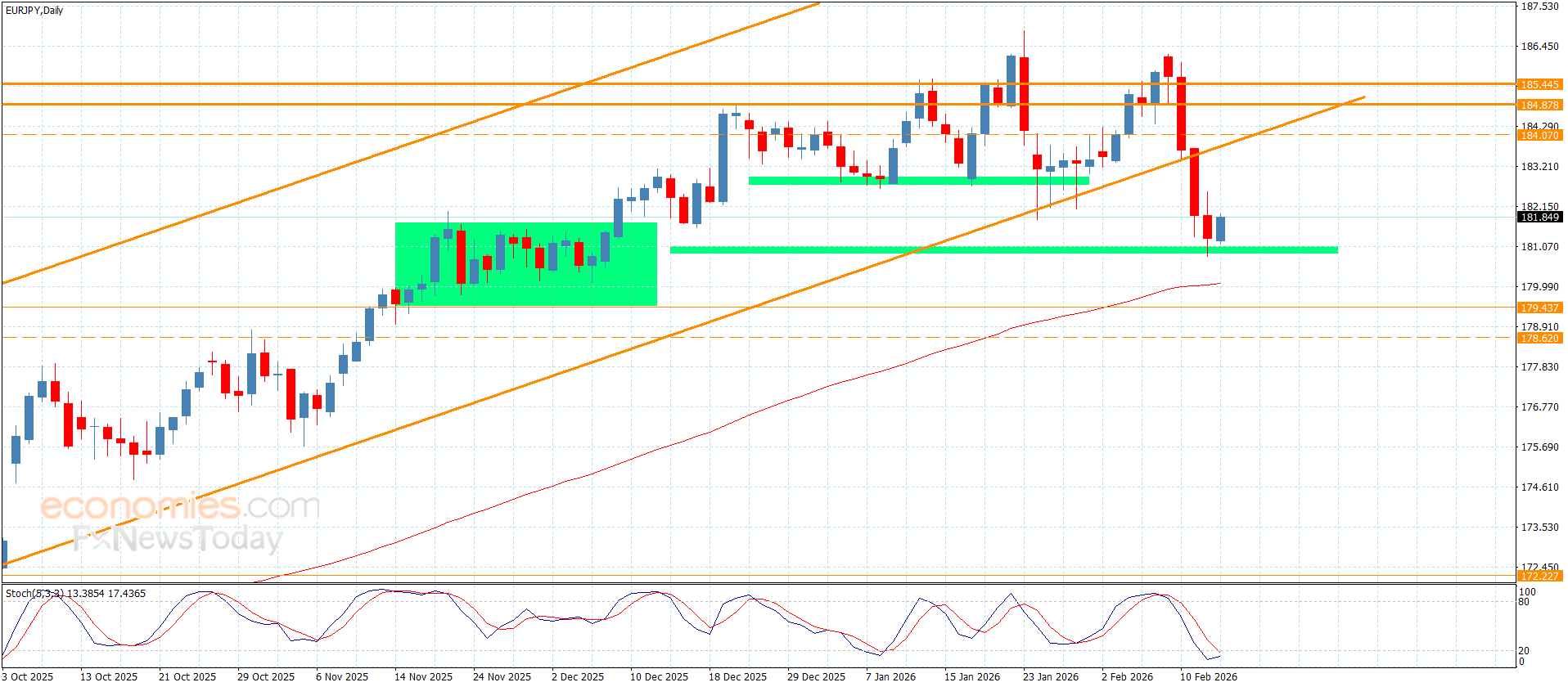 استأنف سعر الزوج بتداولات يوم أمس الهجوم السلبي مستغلا سلبية مؤشر ستوكاستيك ليحقق بذلك كسر مستوى 181.05 لنلاحظ تسلله مباشرة نحو الهدف الثاني المستقر عند 180.80 والذي يشكل بدوره عائق قوي أمام التداولات السلبية الحالية.
