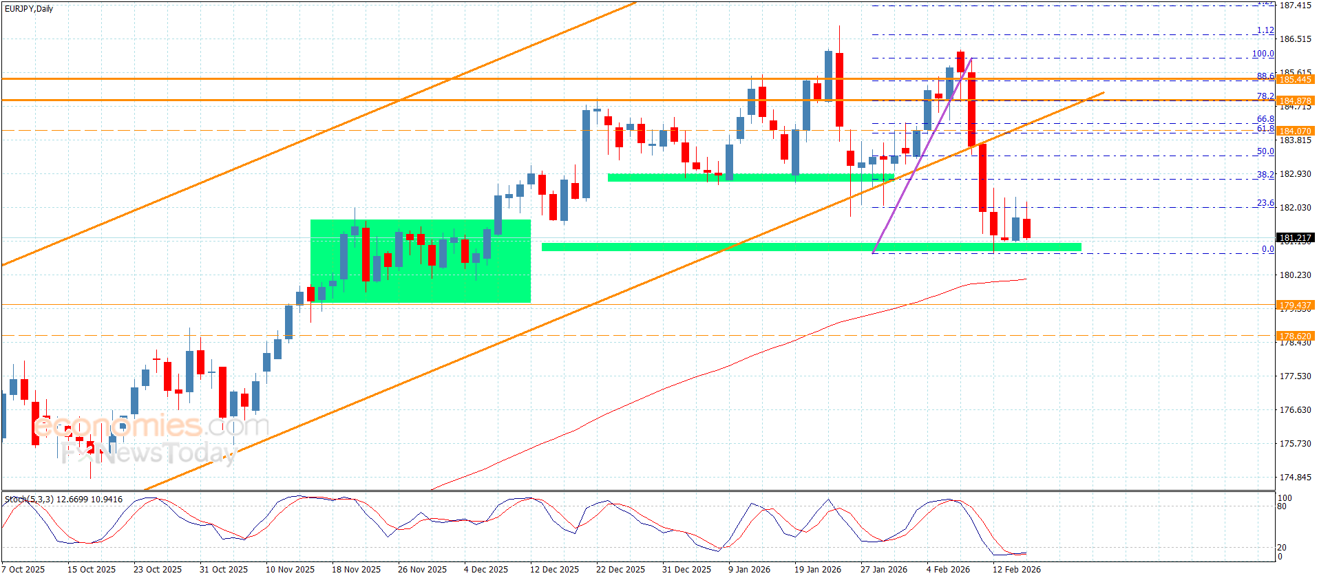 اقترب سعر الزوج بتداولات يوم أمس من الهدف الإيجابي الأول المستقر عند 182.60 بفارق قليل ومن ثم ليتفاعل مع سلبية مؤشر ستوكاستيك مشكلا بعض الموجات السلبية ليقترب من الدعم المتمركز عند 180.85.