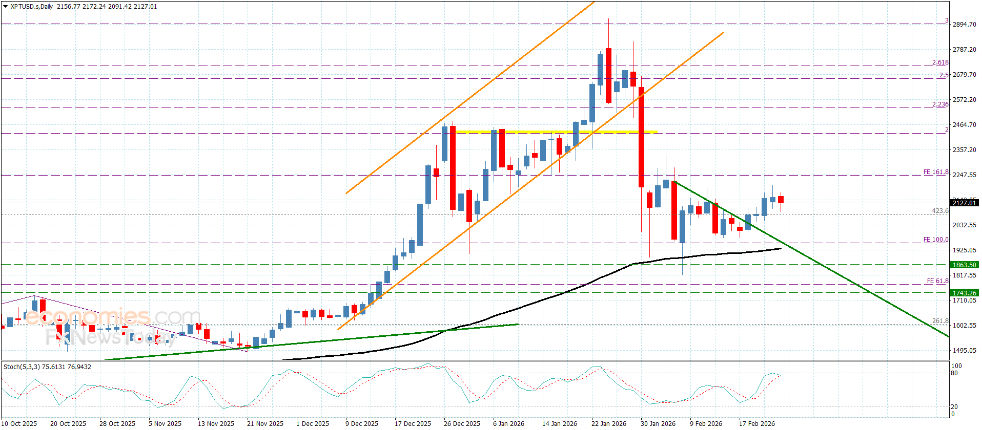 تأثر سعر البلاتين بتداولات يوم أمس بتعارض المؤشرات الرئيسية تحديدا بثبات مؤشر ستوكاستيك دون مستوى 80 ليعوق ذلك الاندفاع الصاعد وليجبره على تقديم بعض التداولات الجانبية باستقراره قرب 2140.00$.