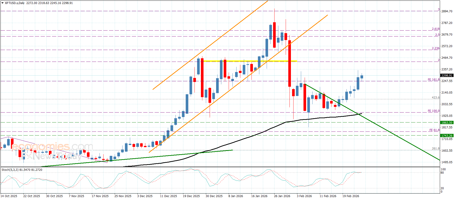 نجح سعر البلاتين بتداولات يوم أمس بتأكيد استعادته للميل الصاعد بتجاوزه للحاجز المستقر عند 2245.00$ وتحقيقه لبعض الأهداف الإضافية المقترحة سابقا بملامسته لمستوى 2348.00$.