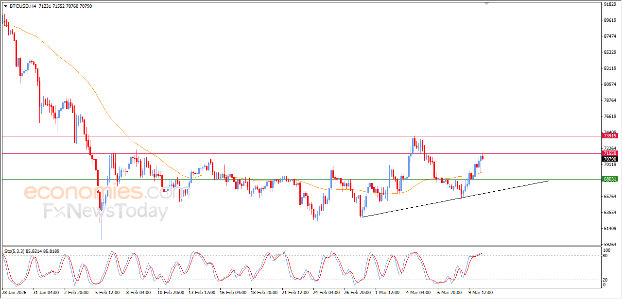 ارتفع سعر البتكوين (BTCUSD) على مستوياته اللحظية الأخيرة، ليصل إلى مهاجمة مستوى المقاومة 71,500$، تلك المقاومة التي كانت هدفاً سعرياً لنا بتحليلاتنا السابقة، وسط سيطرة موجة تصحيحية صاعدة على المدى القصير، مع تحركاته بمحاذاة خط ميل داعم لهذا المسار، كما يستفيد السعر من استمرار الضغط الديناميكي المتمثل في تداولاته أعلى متوسطه المتحرك البسيط لفترة 50، مع توارد الإشارات الإيجابية من مؤشرات القوة النسبية، بالرغم من وصولها لمناطق شديدة التشبع بعمليات الشراء.