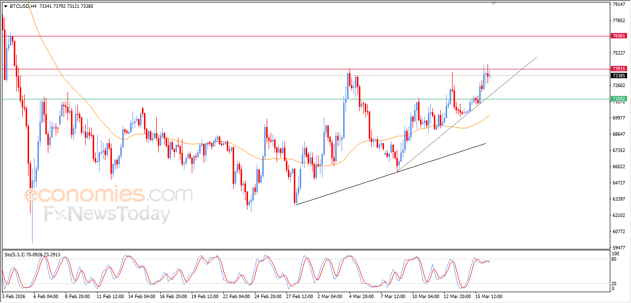 يشهد سعر البتكوين (BTCUSD) تداولات متذبذبة على مستوياته اللحظية الأخيرة، على اثر تماسك مستوى المقاومة المحوري 74,000$، ليحاول السعر اكتساب زخماً إيجابياً قد يساعده على اختراق تلك المقاومة، كما يحاول في الوقت نفسه تصريف البعض من تشبعه الشرائي الواضح بمؤشرات القوة النسبية، خاصة مع بدء ظهور تقاطع سلبي بها، وسط سيطرة الاتجاه التصحيحي الصاعد وتداولاته بمحاذاة خطوط ميل رئيسية وفرعية، مع استمرار الدعم الإيجابي الناتج من تداولاته اعلى متوسطه المتحرك البسيط لفترة 50، ما يعزز من فرص تعافي السعر من جديد.