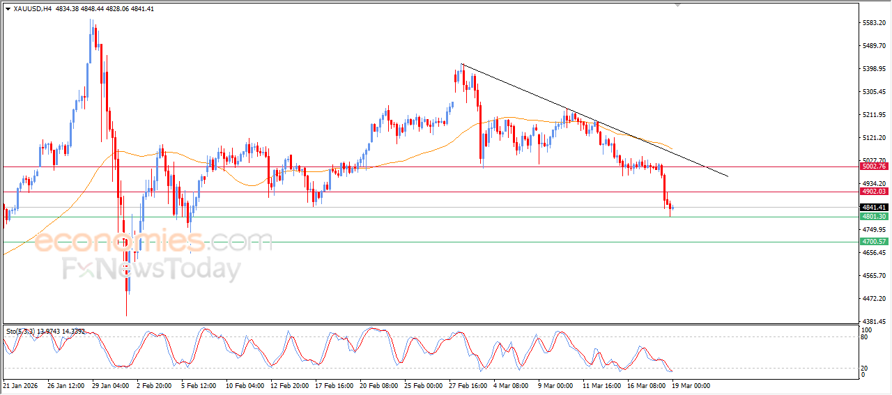 يستقر سعر الذهب (GOLD) على خسائر حادة خلال تداولاته اللحظية الأخيرة، بعد كسره لمستوى الدعم 4,900$، والذي كان يمثل هدفاً أولياً في تحليلاتنا السابقة، قبل أن يمتد التراجع نحو اختبار مستوى الدعم 4,800$ وهو هدفنا السعري الثاني.