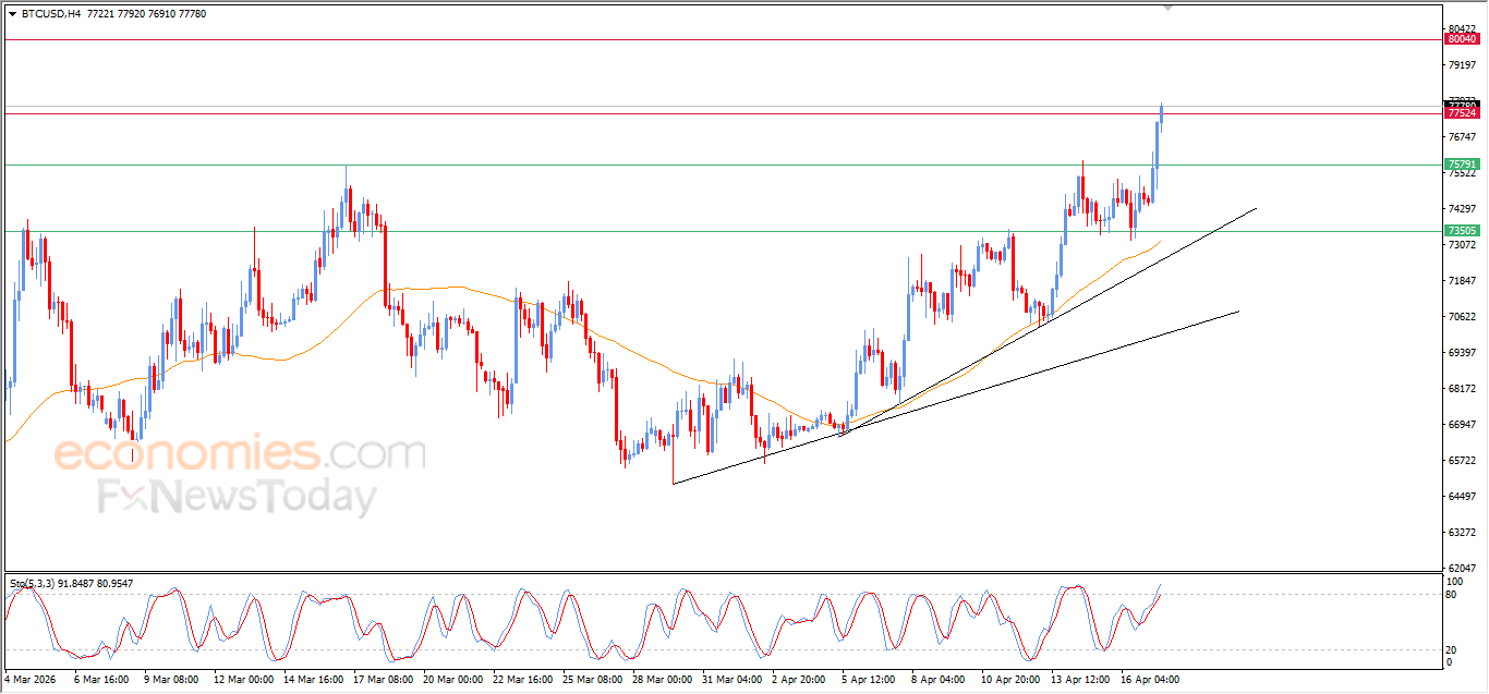 واصل سعر البتكوين (BTCUSD) الصعود خلال تداولاته اللحظية الأخيرة، لينجح في الوصول لمستوى المقاومة 77,500$، تلك المقاومة التي كانت هدفاً سعرياً لنا بتحليلاتنا السابقة، ليستعد حالياً بمهاجمته مستفيداً من الدعم الديناميكي المتمثل في تداولاته أعلى متوسطه المتحرك البسيط لفترة 50، والذي يعزز من استقرار وهيمنة الاتجاه الرئيسي الصاعد على المدى القصير، بالإضافة لتوارد الإشارات الإيجابية من مؤشرات القوة النسبية، بالرغم من وصولها لمناطق شديدة التشبع بعمليات الشراء.