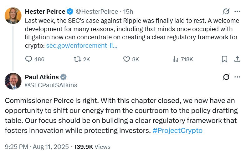 وصفت مفوضة هيئة الأوراق المالية هيستر بيرس في منشور على منصة X يوم الاثنين هذه الخطوة بأنها "تطور مرحب به" يتيح "للعقول التي كانت منشغلة بالتقاضي أن تركز الآن على إنشاء إطار تنظيمي واضح للعملات المشفرة."