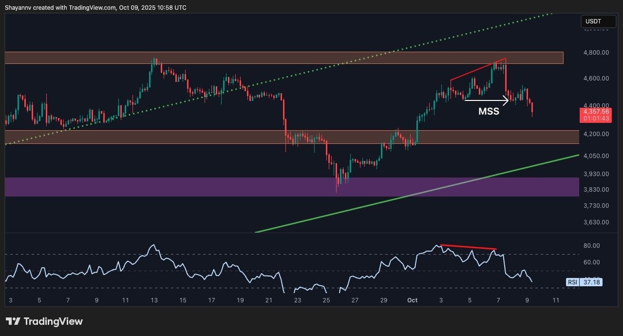يُظهر الرسم البياني للأربع ساعات تحول في هيكل السوق (MSS) بعد فشل الإيثيريوم في تسجيل قمم جديدة فوق 4800 دولار.