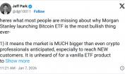 وعلّق بالچوناس: “أحب هذه الخطوة… ذكية”، مضيفًا أن لدى مورغان ستانلي نحو 8 تريليونات دولار من أصول الاستشارات، وقد سمحت بالفعل لمستشاريها بالتخصيص، “فالأجدى أن يكون ذلك عبر صندوق بعلامتهم بدل الدفع لجهة أخرى”.
