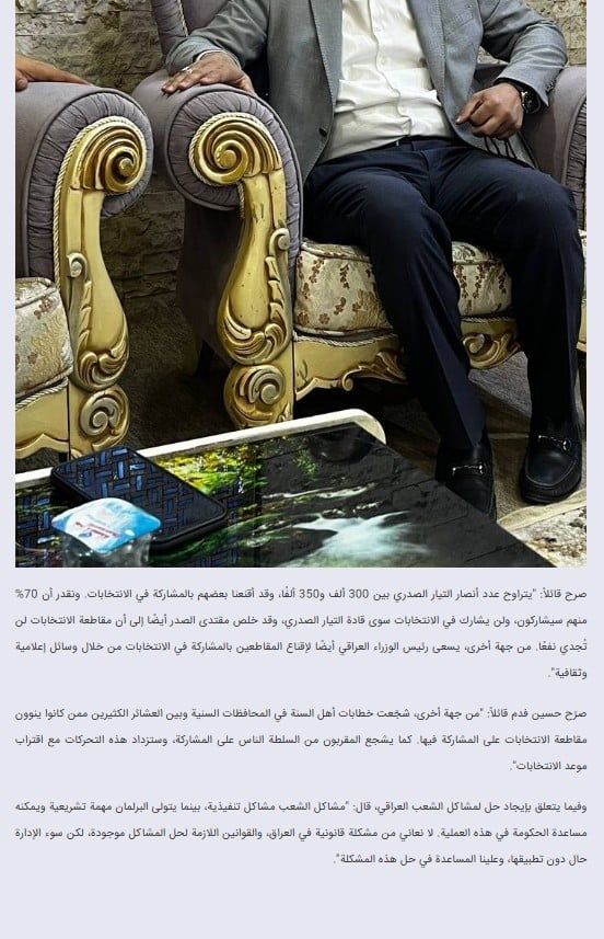 واعتبر ان "الصدر توصل أيضًا إلى أن مقاطعة الانتخابات لن تُجدي نفعًا"، مشيرا الى ان "رئيس الوزراء العراقي أيضًا يسعى لإقناع المقاطعين بالمشاركة في الانتخابات من خلال وسائل إعلامية وثقافية".