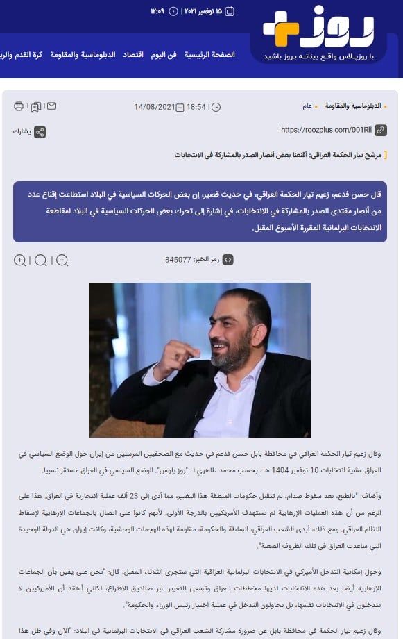 بغداد - ياسين صفوان - ونقل موقع "روز بلاص" الإيراني عن فدعم قوله، إنه "يتراوح عدد أنصار التيار الصدري بين 300 ألف و350 ألفًا، وقد أقنعنا بعضهم بالمشاركة في الانتخابات، ونقدر أن 70% منهم سيشاركون، وفقط قادة التيار الصدري لن يشاركوا بالانتخابات".
