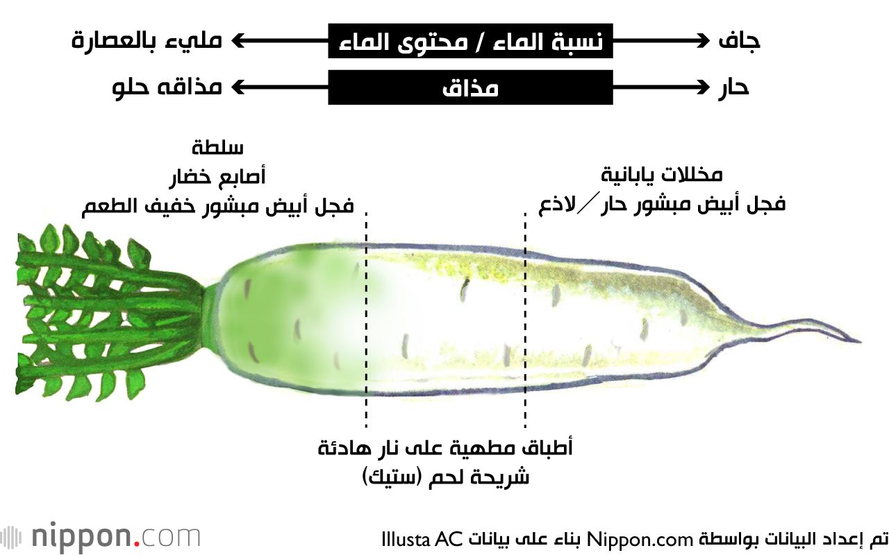 في فصل الصيف، يميل مذاق الدايكون إلى أن يكون أكثر حدّة وحرارة بشكل ملحوظ، ويُعتقَد أن ذلك وسيلته الطبيعية لحماية نفسه من الآفات. كما يختلف الطعم تبعًا للجزء المُستَخدم من الجذر. فالجزء العلوي القريب من الأوراق أكثر عصارة وحلاوة، ويمكن تناوله نيئًا في السلطات أو مقطع على هيئة أعواد خضار. أما الجزء الأوسط فيتميّز بنكهة متوازنة، ما يجعله مناسبًا للأطباق المطهية على نار هادئة أو كطبق رئيسي، مثل تقطيعه إلى شرائح سميكة وطهيه على شكل ”شريحة ستيك“. في حين أن الجزء السفلي الأقرب إلى الجذر يكون أكثر حدّة وحرارة في الطعم، ويُفضَّل فرمُه ناعمًا لاستخدامه في المخللات أو إضافته إلى حساء الميسو.
