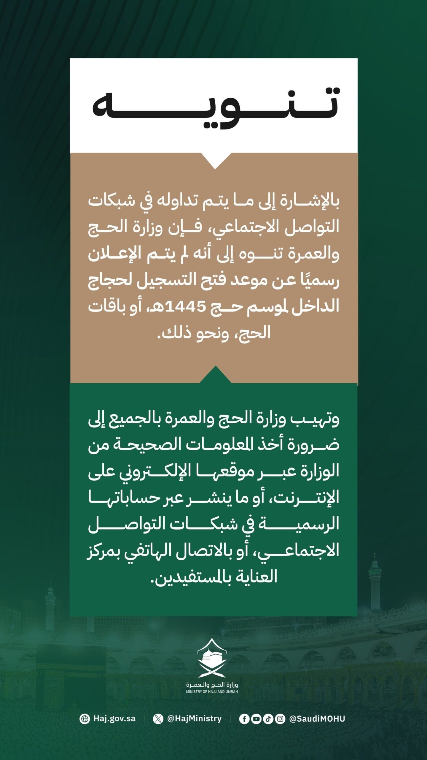 أصدرت وزارة الحج والعمرة اليوم توضيحًا عاجلًا بشأن موعد فتح التسجيل لحجاج الداخل لعام 1445هـ.