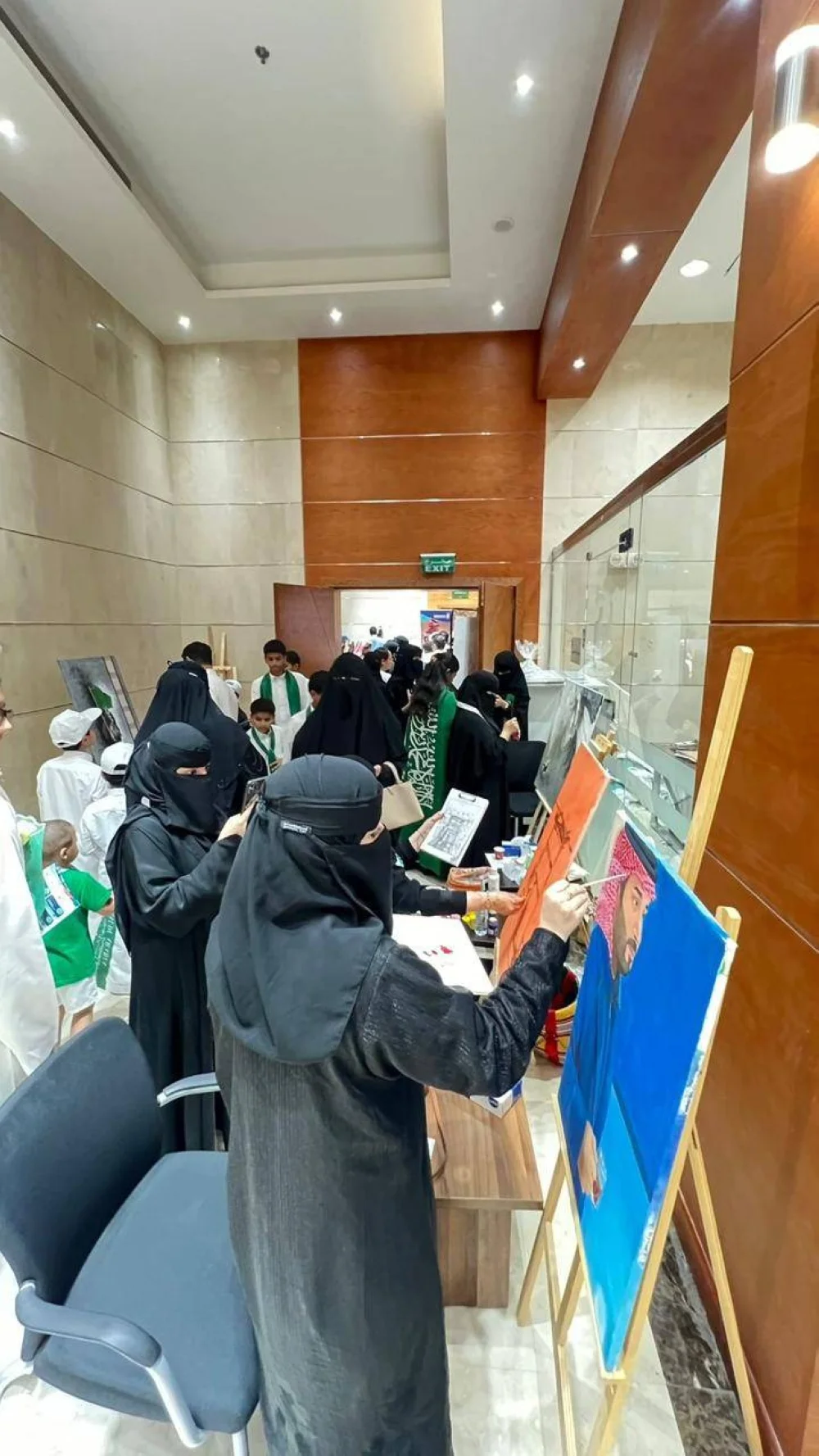 وقد كان للفنانة أرين المويزي بصمة خاصة في هذا الحدث حيث قدمت لوحة جدارية فنية رائعة بفن الفيلوغرافيا ونسجت خيوطها بأسلوب فني مميز يعبر عن هوية اليوم الوطني. هذه اللوحة ليست مجرد عمل فني، بل هي تجسيد لمشاعر الفخر والاعتزاز بالوطن، مما جعلها محط إعجاب الحضور مع مشاركة بعض الزوار في التشكيل بالخيوط . بالإضافة إلى ابداع الفنانيين والفنانات المشاركين بالرسم المباشر في هذه المناسبة الغالية علينا ..