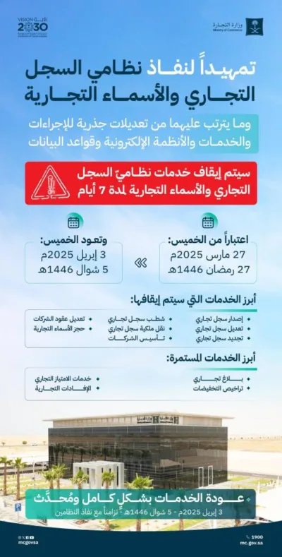التجارة: إيقاف الخدمات المرتبطة بنظامي السجل والأسماء التجارية لمدة 7 أيام