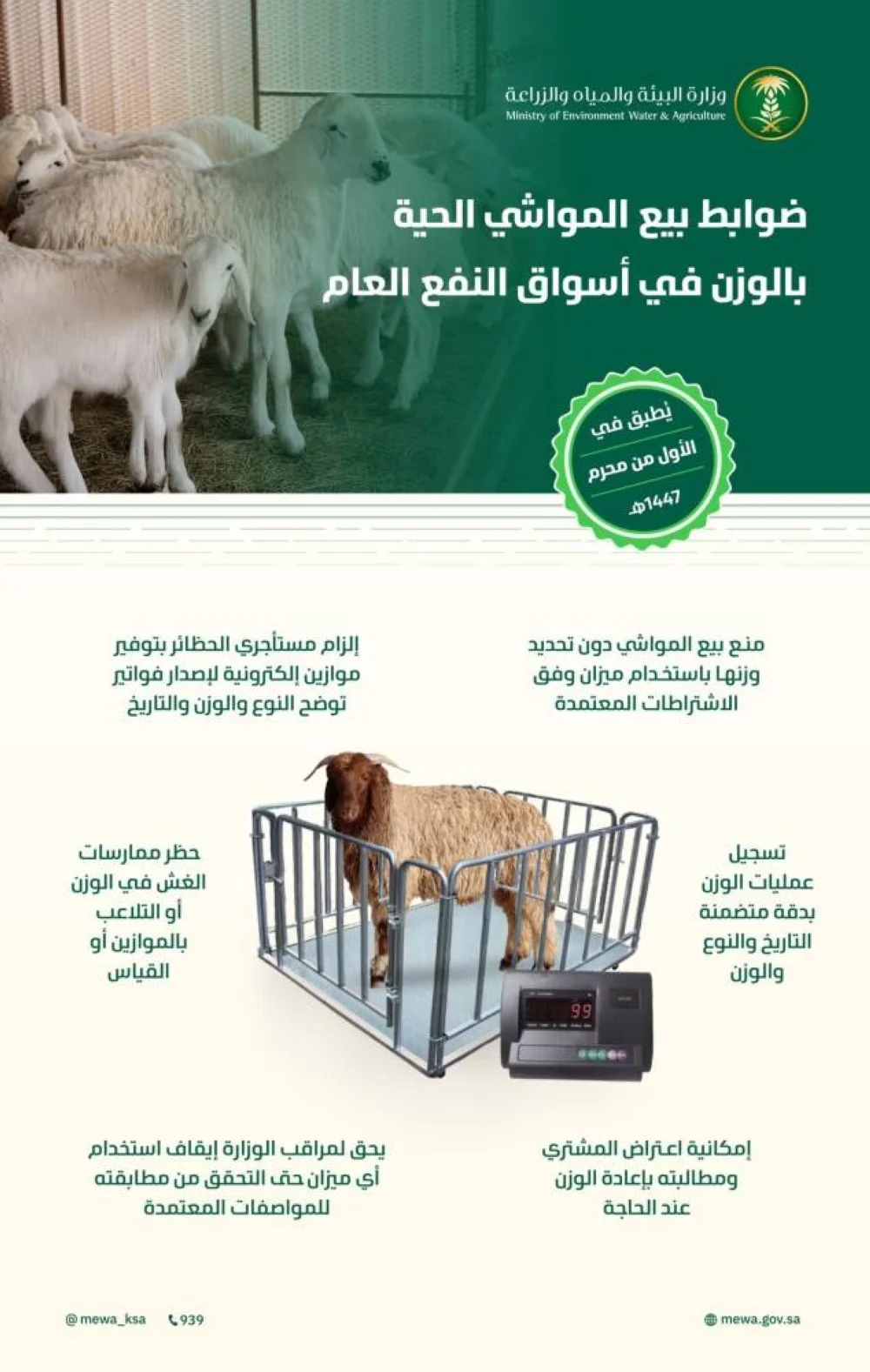 وحددت الوزارة عددًا من الضوابط لبيع المواشي بالوزن؛ بهدف ضمان تطبيق المعايير التي تكفل تداولها وبيعها للمستهلكين، وتحقيق أقصى فائدة مرجوة من هذا الإجراء؛ بما ينعكس إيجابًا على قطاع الثروة الحيوانية في المملكة، إضافةً إلى تعزيز قيم العدالة والشفافية في بيع وشراء المواشي، وتحسين جودة واستدامة الخدمات المقدمة في أسواق النفع العام.